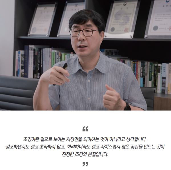 “제가 생각하는 K-조경은 ‘겸이불루(儉而不陋), 화이불치(華而不侈)’라는 말로 표현할 수 있습니다. 저는 조경이란 겉으로 보이는 치장만을 의미하는 것이 아니라고 생각합니다. 검소하면서도 결코 초라하지 않고, 화려하더라도 결코 사치스럽지 않은 공간을 만드는 것이 진정한 조경의 본질입니다. 조경은 삶의 배경이자 일상의 무대입니다. 그렇기에 불필요한 과시와 낭비는 배제하되, 공간을 찾는 사람들이 편안함과 품격을 동시에 느낄 수 있어야 한다고 믿습니다. 저는 K-조경이 앞으로 세계 속에서 인정받기 위해서는 바로 이 철학을 중심에 두어야 한다고 생각합니다. 단순히 예쁘고 웅장한 것을 넘어, 검소하면서도 기품이 있고, 화려하면서도 절제가 깃든 조경. 그것이야말로 한국적 조경의 길이며, 제가 지향하는 가치입니다.”