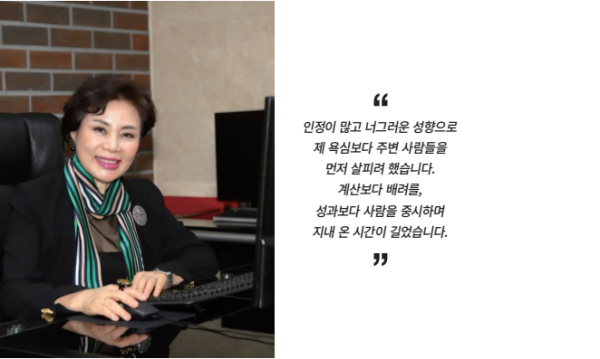 “저는 일방적으로 강하게 누군가를 대하기보다는 부드러운 카리스마로 사람들을 대하려고 해 왔습니다. 무엇인가를 움켜쥐기보다는 나누는 쪽에 더 가까운 삶의 방식이었고, 인정이 많고 너그러운 성향으로 제 욕심보다 주변 사람들을 먼저 살피려 했습니다. 그래서 계산보다 배려를, 성과보다 사람을 중시하며 지내 온 시간이 길었습니다. 그 과정에서 크고 작은 도움을 건네 온 일이 적지 않았고, 주변에서는 ‘그 돈이면 빌딩을 샀어도 됐을 것이다’라는 말을 하기도 합니다. 그럼에도 그런 선택들이 후회로 남지는 않습니다. 무엇보다 두 딸이 각자의 자리에서 잘 자라 주고 있다는 사실이 늘 감사하게 느껴집니다.”