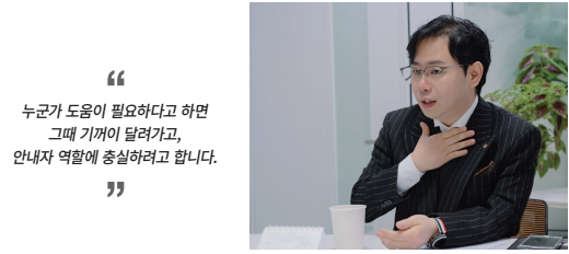 “제 둘째 아이가 100일 무렵, 혈우병이라는 희귀·난치성 질환을 앓았고, 그 결과 단 20일의 입원 치료만으로 6억 원이라는 막대한 병원비를 떠안게 됐습니다. 태아보험이 있었지만 유전질환이라는 이유로 보상 받기가 쉽지 않았습니다. 그 과정에서 보험 약관, 의료법, 등을 꼼꼼히 살펴보며 보험 분야에 통달하게 되었고 가장의 책임을 다하기 위해 보험영업이라는 새로운 길을 걷게 되었습니다. 결국 보험 영업을 시작한 저는 그 과정에서 저와 같은 처지에 놓인 분들이 생각보다 훨씬 많다는 사실을 알게 되었습니다. 그래서 우리 아이처럼 수억 원에 달하는 치료가 필요한 경우를 과연 어디까지 감당할 수 있을지, 또 치료제가 없는 분들에게는 어떤 방식으로 도움이 될 수 있을지를 보험과 연결해 고민하게 되었습니다. 그러던 중 어머니께서 간경화로 간이식이 필요한 위급한 상황에 놓이셨고, 저는 위험을 감수하고 어머니께 간을 공여하기로 결정했습니다. 수술 이후 회복하던 과정에서 문득 떠오른 장면이 있습니다. 어머니와 함께 수술방에 들어가기 불과 5분 전, 어머니께서 제게 남기신 말씀이었습니다. 그 말은 다름 아닌 ‘기부’라는 단어였고, 그 순간 제 머릿속에는 어머니의 일생이 스쳐 지나갔습니다.”